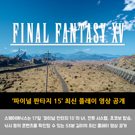 스퀘어에닉스는 17일 '파이널 판타지 15'의 UI, 전투 시스템, 초코보 탑승, 낚시 등의 콘텐츠를 확인할 수 있는 53분 길이의 최신 플레이 영상 공개