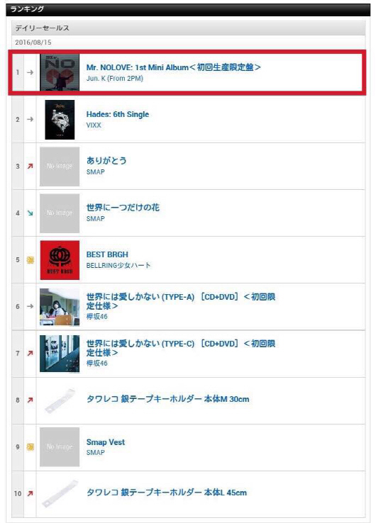 2PM JUN.K(준케이)가 지난 8월9일 발표한 한국 첫 솔로 앨범 'Mr. NO♡'가 일본에서 발매된 첫날인 14일과 둘째날인 15일 일본 최대 음반매장 타워레코드 데일리 세일즈 랭킹 2일 연속 1위를 차지했다.