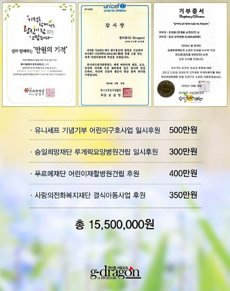 지디가 공개한 기부 내역 외에도 지드래곤 팬클럽 Number-G가 유니세프에 1,000만원, Always-GD가 지디숲과 승일희망재단에 2,900만원, 지디월드가 션과 함께하는 '만원의 기적'에 818만원, 허니지용이 푸르메 재단에 300만원, 중국 g-one이 유니세프에 314만원 (18818위안), 캡틴 지(8818위안) 147만원, 일본 팬싸이트도 110만원 등 다양한 기부단체에 지드래곤 이름으로 기부됐다.