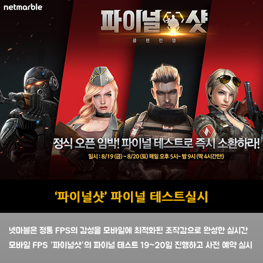 넷마블은 정통 FPS의 감성을 모바일에 최적화된 조작감으로 완성한 실시간 모바일 FPS '파이널샷'의 파이널 테스트 19~20일 진행하고 사전 예약 실시