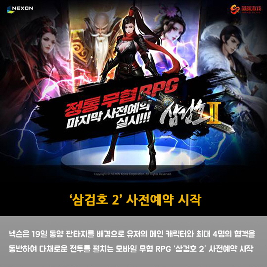 넥슨은 19일 동양 판타지를 배경으로 유저의 메인 캐릭터와 최대 4명의 협객을 동반하여 다채로운 전투를 펼치는 모바일 무협 RPG '삼검호 2' 사전예약 시작