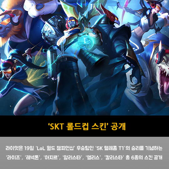 라이엇은 19일 'LoL 월드 챔피언십' 우승팀인 'SK 텔레콤 T1'의 승리를 기념하는 '라이즈', '레넥톤', '아지르', '알리스타', '엘리스', '칼리스타' 총 6종의 스킨 공개
