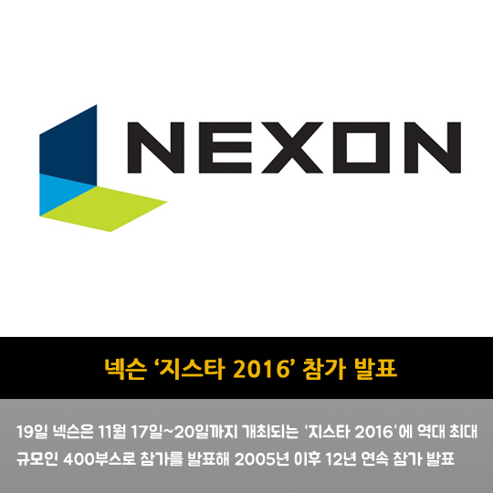 19일 넥슨은 11월 17일~20일까지 개최되는 '지스타 2016'에 역대 최대 규모인 400부스로 참가를 발표해 2005년 이후 12년 연속 참가 발표