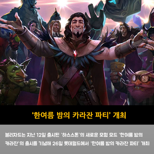 블리자드는 지난 12일 출시된 '하스스톤'의 새로운 모험 모드 '한여름 밤의 카라잔'의 출시를 기념해 26일 롯데월드에서 '한여름 밤의 카라잔 파티' 개최