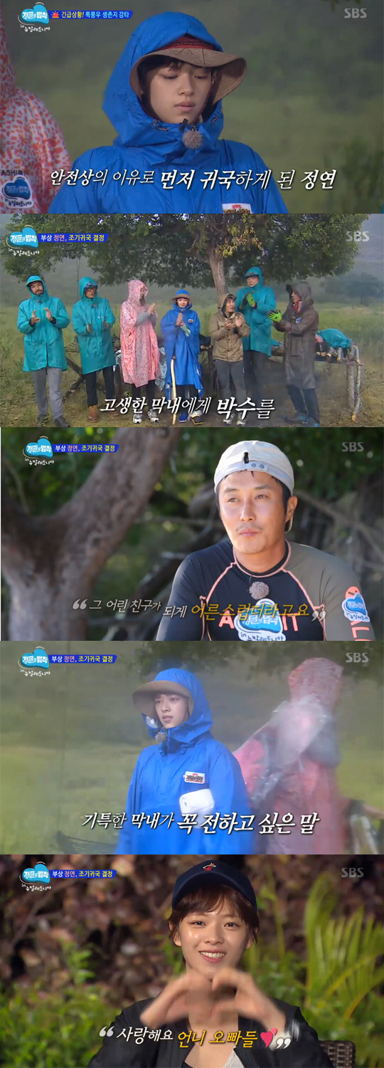 하지만 폭풍우의 습격으로 병만족은 위기에 빠졌다. 결국 제작진은 안전상의 이유로 정연의 하차를 결정했다. 족장 김병만은 "참 어른스러운 친구"라며 안타까워했다.