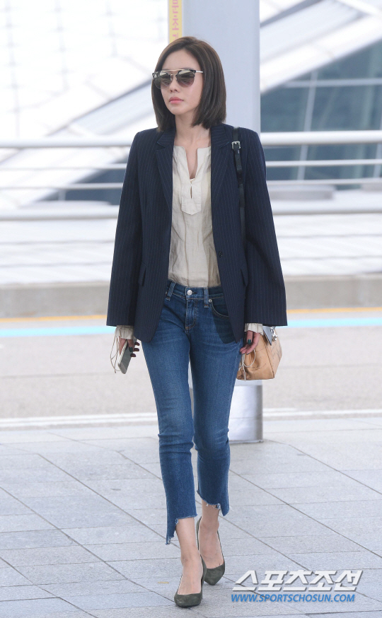김아중은 네이비 컬러 핀스트라이프 재킷을 착용해 시크한 무드를 연출했다. 남자의 수트를 연상 시키는 네이비 컬러와 핀 스트라이프의 조합이 세련된 느낌을 준다. 어두운 톤 아우터였지만 루즈한 핏과 다른 아이템과의 매치가 어우러져 스타일이 살아있는 공항 패션이 완성되었다.