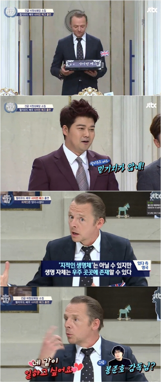 지난 22일 방송된 JTBC '비정상회담'에서는 영국 출신으로 할리우드에서도 활약 중인 배우 사이먼 페그가 특별 출연했다. 많은 내한 스타들이 '뉴스룸'을 즐겨 찾지만, 사이먼 페그는 특별히 '비정상회담'을 출연을 원했고 지난 15일 녹화를 마쳤다.
