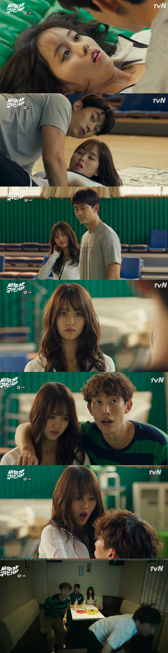 23일 '싸우자귀신아(이하 싸귀)' 14화에서 박봉팔(옥택연)은 기억을 잃은 김현지(김소현)와 체육관에서 호신술 훈련을 하던 도중 묘한 분위기를 연출했다. 얼떨결에 서로에게 올라탄 모양새가 된 것.