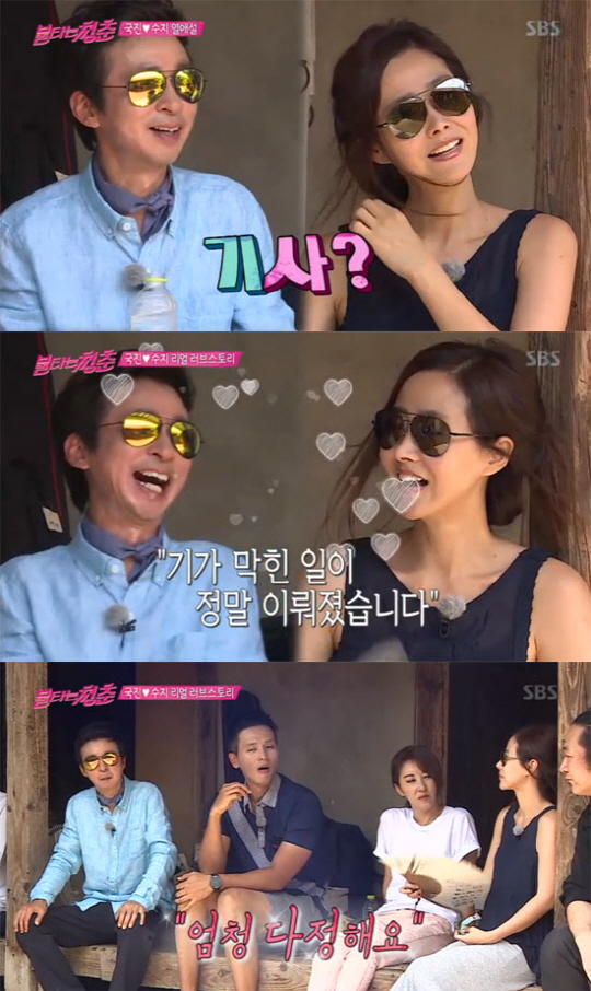 궁금했던 청춘들은 "양가 부모님에게 인사를 했다. 결혼발표. 열애설 인정이라는 기사가 났다"라며 진실을 물었다. 김국진은 "열애설 인정. 딱 그것만 맞죠"라고 답했다. "촬영하면서 조금씩 마음이 움직였다"라고 밝혔다.