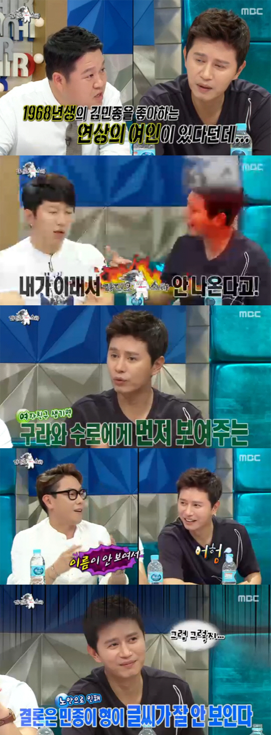 이날 MC 김구라는 김민종의 여자 문제에 대해 심층 질문에 나섰다. 김민종은 "왜 연애를 안 하느냐. 서장훈도 도와주지 않느냐"는 질문에 당황스러워하며 "'라스' 때문"이라고 답했다. 김민종은 "과거 '라스'에서 20대만 좋아한다고 해서 연애를 못 하는 것 같다. 다른 질문으로 넘어가자"고 유도했다. 하지만 김구라는 오히려 최근 신상 정보로 들은 다른 여성을 언급하며 "4살 연상의 여인이 김민종을 좋아한다던데 잘해봐라. 20대만 원하지 않는다고 빨리 말하라"고 독촉했고, 김민종은 끝내 "나이는 중요하지 않다"고 공개발언하기에 이르렀다.