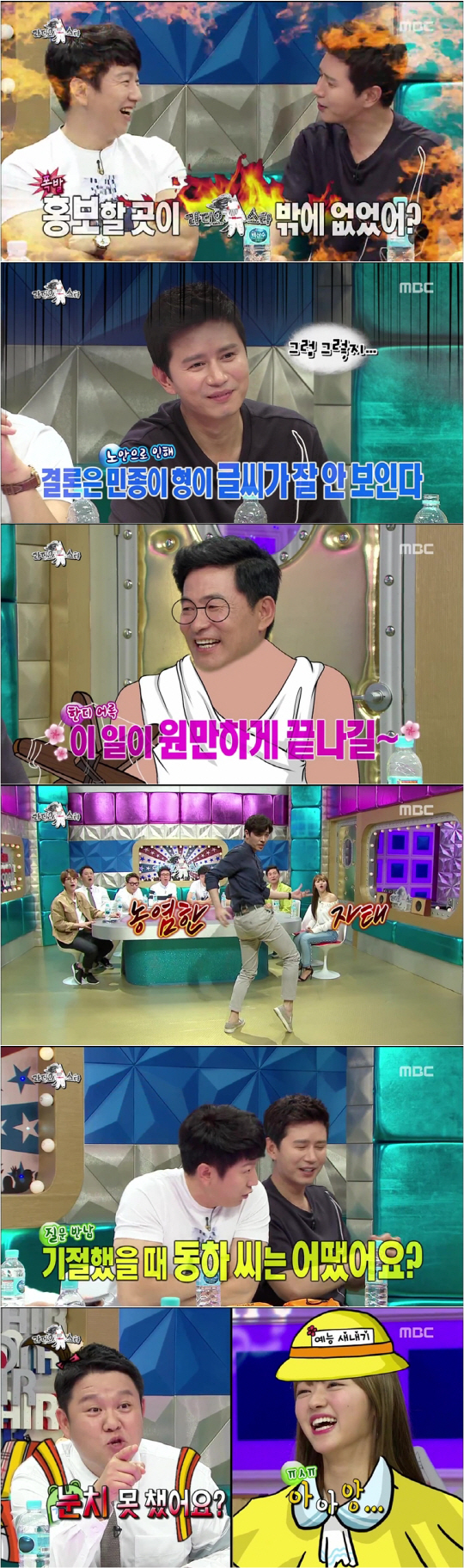 [스포츠조선 조윤선 기자] '라디오스타' 김민종이 '민종몰이'의 희생양이 돼 방송 내내 큰 웃음을 선사했다. 4MC와 김수로는 한마음으로 '김민종 놀리기'에 동참해 김민종의 멘탈을 너덜너덜하게 만들었다. 또한 김민종-김수로-이한위-이동하-유아는 과장되지 않은 솔직 담백한 입담으로 자신의 매력을 홍보해 시청자들의 마음을 사로잡았다.