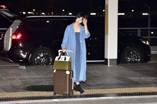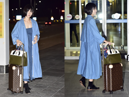 쿨톤 피부를 갖고 있는 배두나에게도 잘 어울리는 컬러다. 그는 짙은 데님 소재의 롱 원피스와 에어리 블루 색감의 롱 코트를 매치해 감각적이고 편안한 공항 패션을 선보였다. 드레스와 코트의 긴 기장감은 배두나의 길고 날씬한 몸매와도 잘 어울리는 듯 했다. 슈즈는 스티치 장식이 가미된 매니시한 로퍼를 선택해 편안하면서도 스타일리시한 감각을 뽐냈다.