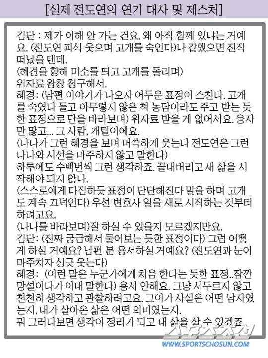전도연은 초짜 변호사로서의 긴장, 불편한 질문을 받아 난감한 마음, 남편에 대한 복잡한 심리를 여유롭게 표현해 내면서 동시에 김혜경이 가진 의지를 보여줬다.