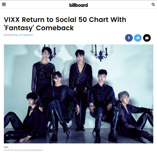 빅스는 음원 차트 외에도 각종 SNS에서 활발하게 거론되는 인기 아티스트를 대상으로 집계하는 빌보드 소셜 50차트에서도 34위로 순위 상승하며 폭넓은 인기와 영향력을 증명했다. 이번 소셜 50차트에는 아리아나 그란데, 셀레나 고메즈, 드레이크, 저스틴 비버, 리한나 등 세계적인 톱 가수들이 상위권을 기록하고 있어 케이팝 대표 주자로서 높아진 빅스의 위상을 확인할 수 있다.