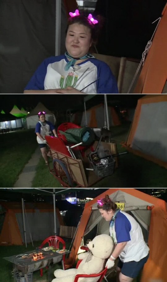 결국 이국주가 선택한 열대야 극복 방법은 '한밤의 캠핑'이었다. 더운 집을 떠나 한강 캠핑장을 찾은 것. 집과는 사뭇 다른 시원한 밤공기와 끊임없이 쏟아지는 먹방 메뉴에 이국주는 연신 행복한 미소를 지어보였다는 후문.
