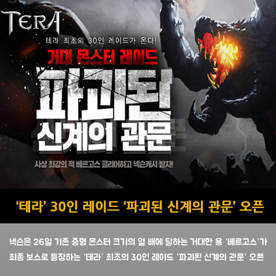 넥슨은 26일 기존 중형 몬스터 크기의 열 배에 달하는 거대한 용 '베르고스'가 최종 보스로 등장하는 '테라' 최초의 30인 레이드 '파괴된 신계의 관문' 오픈