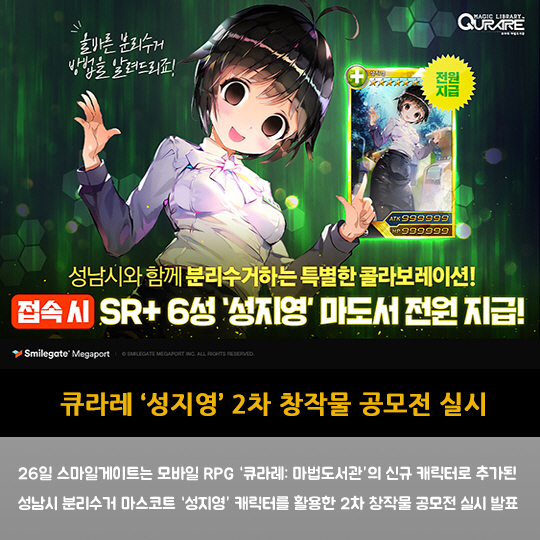 26일 스마일게이트는 모바일 RPG '큐라레: 마법도서관'의 신규 캐릭터로 추가된 성남시 분리수거 마스코트 '성지영' 캐릭터를 활용한 2차 창작물 공모전 실시 발표