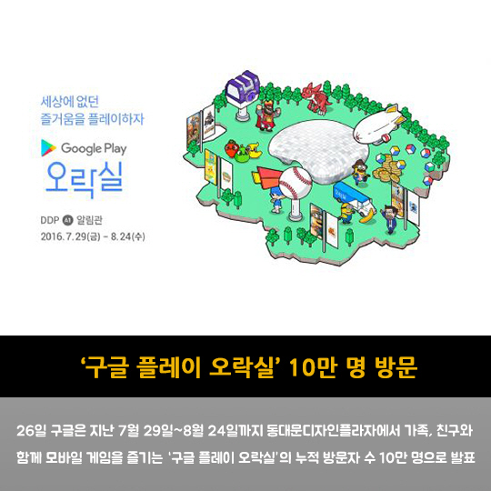 26일 구글은 지난 7월 29일~8월 24일까지 동대문디자인플라자에서 가족, 친구와 함께 모바일 게임을 즐기는 '구글 플레이 오락실'의 누적 방문자 수 10만 명으로 발표