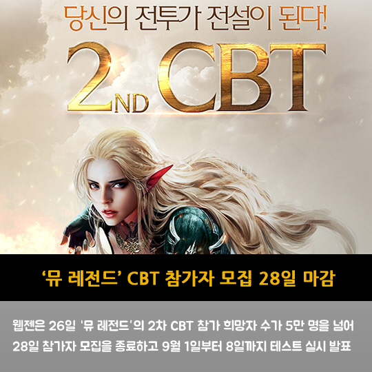 웹젠은 26일 '뮤 레전드'의 2차 CBT 참가 희망자 수가 5만 명을 넘어 28일 참가자 모집을 종료하고 9월 1일부터 8일까지 테스트 실시 발표