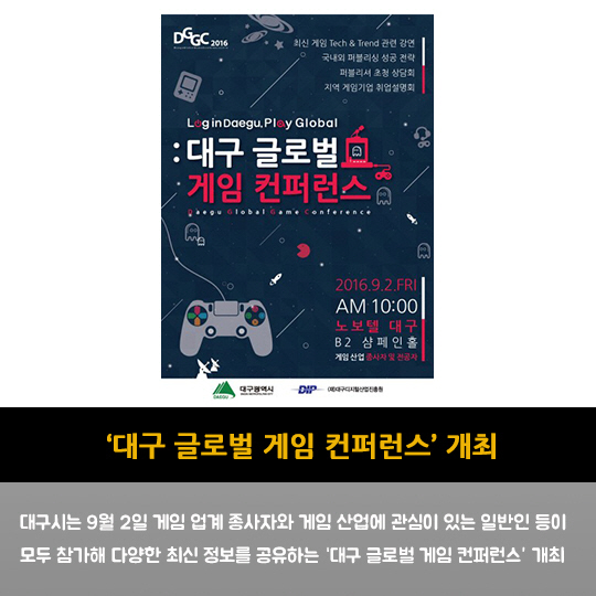 대구시는 9월 2일 게임 업계 종사자와 게임 산업에 관심이 있는 일반인 등이 모두 참가해 다양한 최신 정보를 공유하는 '대구 글로벌 게임 컨퍼런스' 개최