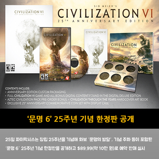 25일 파이락시스는 창립 25주년을 기념해 화보 '문명의 발달', 기념 주화 등이 포함된 '문명 6' 25주년 기념 한정판을 공개하고 $89.99(약 10만 원)로 예약 판매 실시