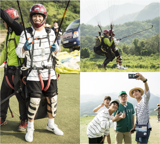 그런가 하면 태현 팀(차태현-데프콘-김종민-박보검)은 패러글라이딩 체험 장소에서 셀카를 통해 추억을 남기는 모습. 지난 주 고소공포증을 이겨내고 예능 9년 만에 공중 놀이기구 탑승에 성공한 김종민의 모습까지 함께 담겨있어, 과연 그가 차태현과 함께 패러글라이딩에 도전할지 궁금증을 높이고 있다.