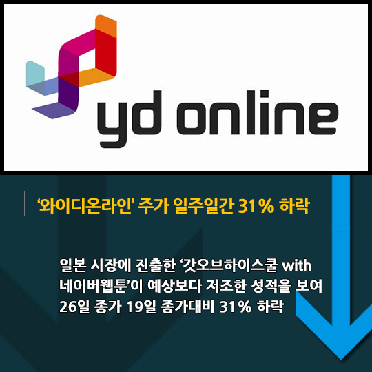 일본 시장에 진출한 '갓오브하이스쿨 with 네이버웹툰'이 예상보다 저조한 성적을 보여 26일 종가 19일 종가대비 31% 하락