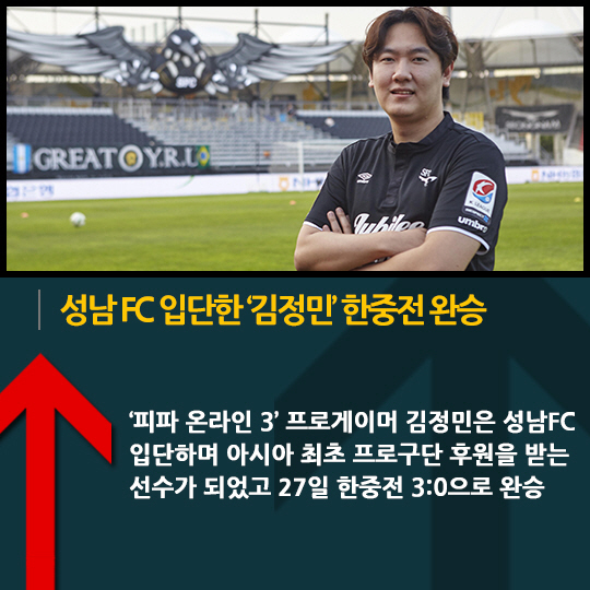 '피파 온라인 3' 프로게이머 김정민은 성남FC 입단하며 아시아 최초 프로구단 후원을 받는 선수가 되었고 27일 한중전 3:0으로 완승