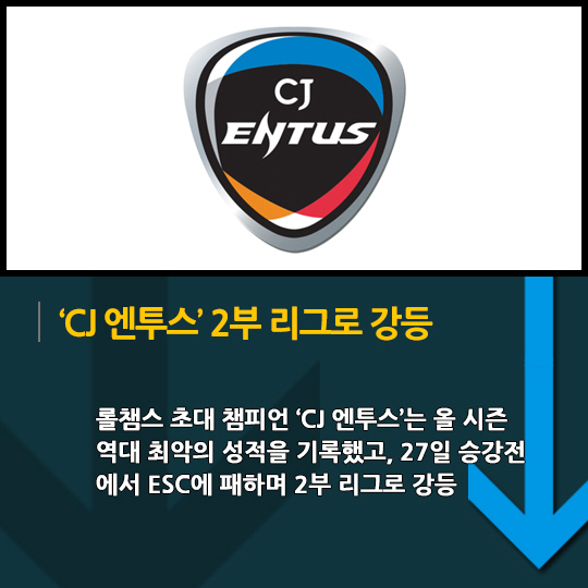 롤챔스 초대 챔피언 'CJ 엔투스'는 올 시즌 역대 최악의 성적을 기록했고, 27일 승강전 에서 ESC에 패하며 2부 리그로 강등