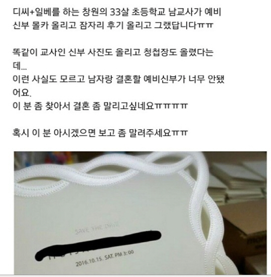 사건은 지난 30일 창원지역 페이스북에 "창원 33살 초등남교사와 결혼할 예비신부 구해주세요"라는 게시물이 올라오면서 빠르게 알려지기 시작했다. 지역 맘카페에 올라온 글을 공유한 것. 내용을 보면 황당하다. 초등학교 남자교사가 결혼할 예비신부 몰카와 잠자리 후기를 인터넷에 올렸다며 신부에게 알려 결혼을 막아야 한다는 내용이 담겼다.
