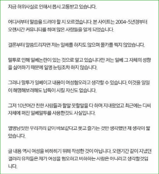 뒤이어 남자 교사가 한 커뮤니티에 남긴 문제의 글도 잇따라 공개됐다. 일베 유저들이 사용하는 말투로 적나라하게 표현돼 있다.