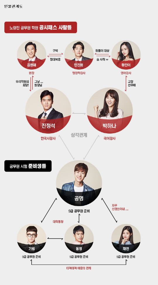이와 함께 이날 '혼술남녀' 제작진은 시청자들의 이해를 돕기 위해 인물들의 관계를 한눈에 알 수 있는 관계도를 함께 공개했다. 주연을 맡은 하석진, 박하선, 공명(공명 역)을 중심으로 한 강사들과 공시생들의 모습이 앞으로의 전개에 대한 궁금증을 불러일으킨다. 하석진, 박하선, 공명의 삼각관계는 물론 공명이 정채연(채연 역)과 미묘한 기류를 형성할 것으로 보여 과연 이들 관계의 향방이 어떻게 될지 기대를 모은다.