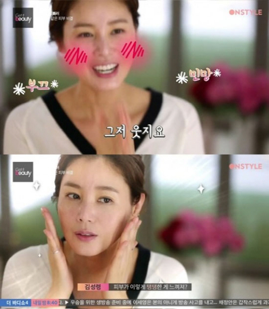 김성령은 탄력있는 피부의 비결에 대해 "나도 스킨케어 샵이나 피부과를 가끔 가기도 한다"라면서도, "하지만 집에서 탄력을 위해 꾸준히 관리하는 것도 중요하다. 그렇게 관리를 해야만 탱탱볼처럼 탱탱한 피부를 가질 수가 있다"라고 설명했다.
