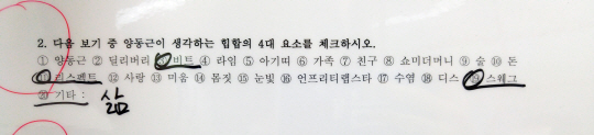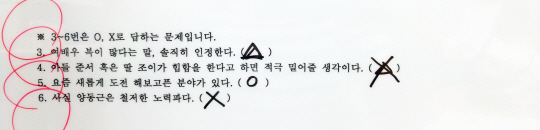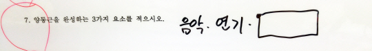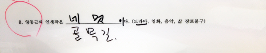 4번 문제는 양동근에게 엄청난 고민과 시련을 안겨줬던 문제였습니다. 요즘 KBS2 "슈퍼맨이 돌아왔다"에서 아들 준서, 딸 조이와 함께 단란한 가족 생활을 보여주고 있는 양동근. 무심한 듯 하면서도 다정한 양동근만의 육아법에 많은 시청자들 또한 애정을 가지고 지켜보고 있습니다. 그런 그에게 '아들 준서 혹은 딸 조이가 힙합을 한다고 하면 적극적으로 밀어줄 것이냐'는 최대의 난제를 던졌습니다. 그는 풀 때부터 이 문제에서 다음 문제로 넘어가지 못하고 한참동안 고민을 했는데요. 처음 적었던 답은 세모였습니다. 그.러.나. 4번 풀이를 시작하자 "힙합을 한다고 하면...(엄청난 고민)"이라고 하더니 내려놨던 펜을 다시 집어들고 "아니야, 지금 세모라고 했는데 다시 X로 바꿀게요"라며 급하게 X표시를 그렸습니다. 갑자기 답을 바꾼 이유를 묻자, "저는 '그래 해봐'라고 하기 보다는 힙합이 아닌 다른 무언가를 제시해줄거예요. 왜냐하면 제가 힙합을 하면서 너무 힙합에 편중된 삶을 살아서 그것에 대해서 편협했었어요. 그래서 만약 아이들이 힙합을 하겠다고 하면 물론 조언도 해주겠지만 제가 겪었던 그런 편협함을 깨주기 위해 다른 것을 제시하지 않을까하는 생각이에요"라고 진지한 생각을 밝혔습니다. 양동근 역시 아이들 문제에 있어서는 진중하고 자상한 아빠였습니다.
