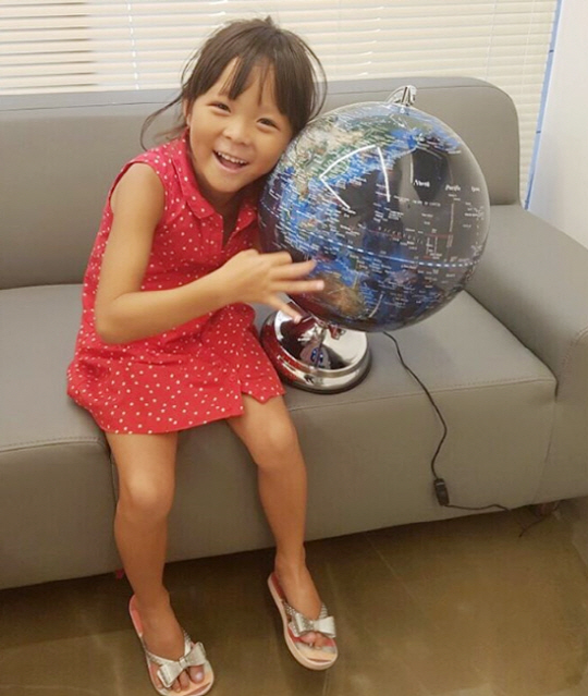 새빨간 원피스 차림의 추사랑은 자신의 얼굴보다 큰 지구본을 들고 인증샷을 찍고 있는 모습.