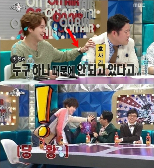 이후에도 민경훈은 "유재석이 좋냐, 강호동이 좋냐"는 질문에 "가만 있자..."라며 강호동을 향해 의미심장한 미소를 지어보인 후 "재석이 형은 굉장히 사람이 젠틀하고 호동이 형은 그것과 완전히 거리가 멀고. 의리는 있는 것 같은데 나는 본 적이 없다"고 말해 강호동을 당황하게 했다. 여기서 그치지 않고 강호동 귀에 입을 가까이 대고 "유재석~"이라고 속삭여 강호동을 비롯한 모두를 쓰러지게 했다.