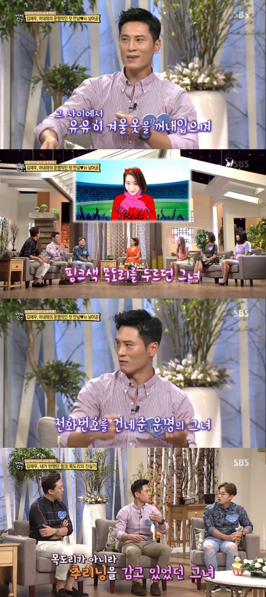 이어 김재우는 "당시 한국 여성들이 '비 더 레즈' 티셔츠를 다 찢어서 탱크탑으로 만들어 갔는데 발만 동동 구르더라. 그 사이에서 누가 겨울 옷을 꺼내 입으면서 핑크색 목도리를 딱 두드더라. 그때 든 생각이 저 여자는 공부를 했구나, 저 여자가 내 아내면 나는 평생을 믿고 맡길 수 있겠구나 싶었다"라며 "그렇게 하고 한 마디도 못 걸고 헤어졌었다. 그리고 나서 한국 대 아르헨티나전이 있었는데 6만여 명을 수용하는 곳이었다. 그런데 아내가 내 옆자리에 ?瞞年? 이건 운명이었다"고 밝혔다.
