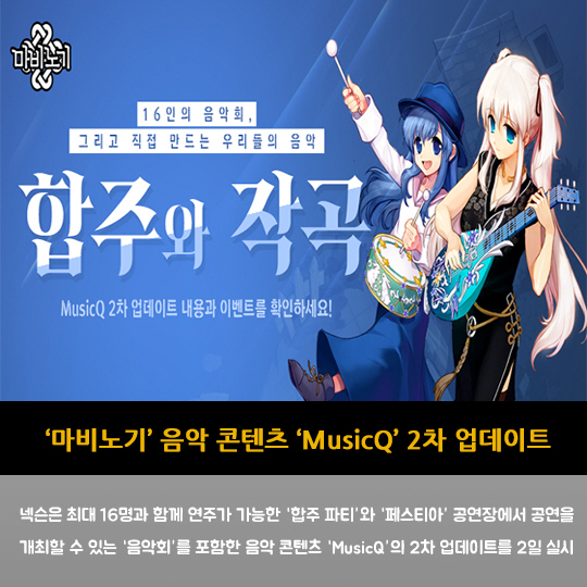 넥슨은 최대 16명과 함께 연주가 가능한 '합주 파티'와 '페스티아' 공연장에서 공연을 개최할 수 있는 '음악회'를 포함한 음악 콘텐츠 'MusicQ'의 2차 업데이트를 2일 실시
