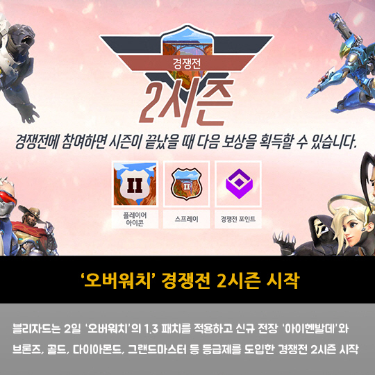 블리자드는 2일 '오버워치'의 1.3 패치를 적용하고 신규 전장 '아이헨발데'와 브론즈, 골드, 다이아몬드, 그랜드마스터 등 등급제를 도입한 경쟁전 2시즌 시작