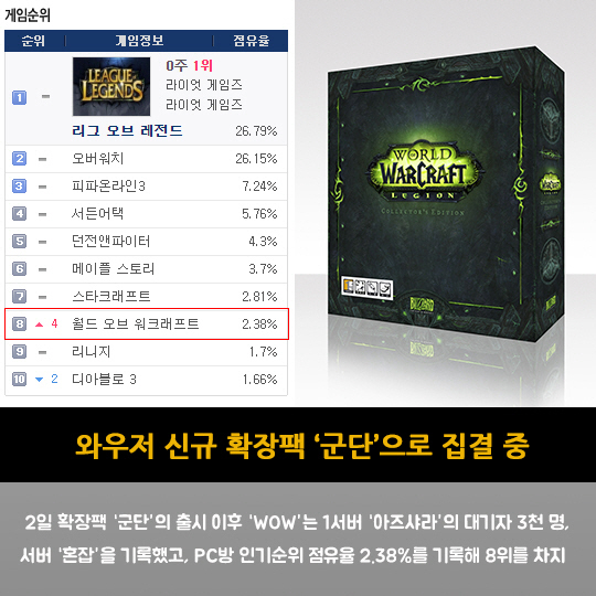 2일 확장팩 '군단'의 출시 이후 'WOW'는 1서버 '아즈샤라'의 대기자 3천 명, 서버 '혼잡'을 기록했고, PC방 인기순위 점유율 2.38%를 기록해 8위를 차지