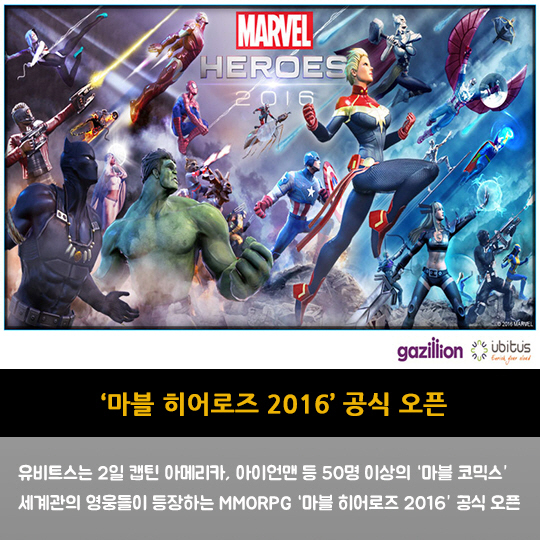 유비트스는 2일 캡틴 아메리카, 아이언맨 등 50명 이상의 '마블 코믹스' 세계관의 영웅들이 등장하는 MMORPG '마블 히어로즈 2016' 공식 오픈