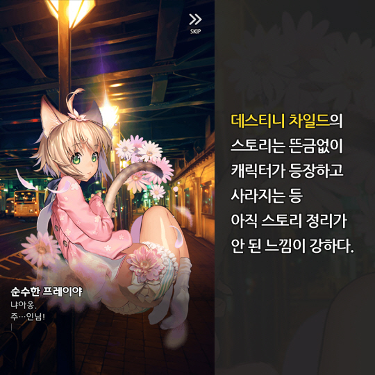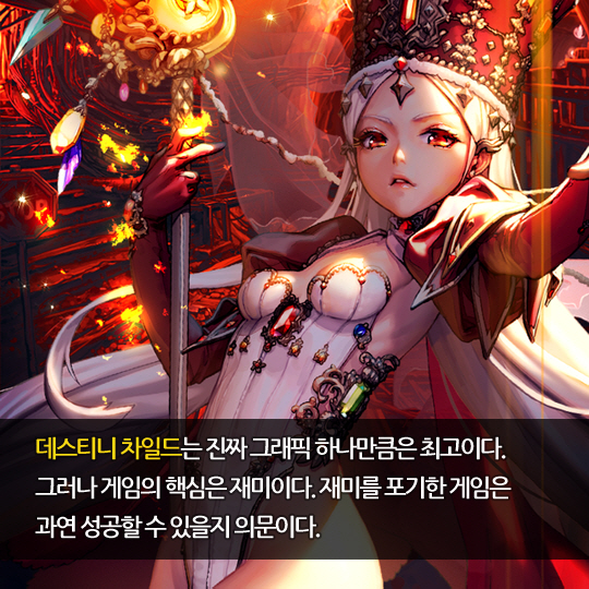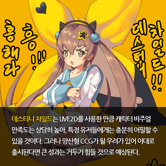 데스티니 차일드는 LIVE2D를 사용한 만큼 캐릭터 비주얼 만족도는 상당히 높아, 특정 유저들에게는 충분히 어필할 수 있을 것이다. 그러나 양산형 CCG가 될 우려가 있어 이대로 출시된다면 큰성과는 거두기 힘들 것으로 예상된다.