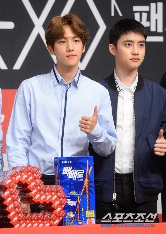 수호와 백현은 비슷한 분위기를 풍기는 블루 컬러의 셔츠로 깔끔 단정한 패션을 보여줬다. 특히 두 사람 다 블루 바탕에 네이비 컬러로 포인트가 있는 셔츠를 선택해 트윈룩 같은 이미지를 자아냈다. 수호는 칼라와 소매에 동일한 화이트&네이비 컬러 포인트가 들어가 잘생김 잔뜩 묻은 얼굴을 강조하는 효과를 냈다. 이와는 조금 다르게 백현은 라인 포인트가 들어간 셔츠를 선택했다. 네크 라인과 단추를 따라 네이비 컬러의 라인이 들어가있어 밋밋하지 않은 느낌을 냈다.