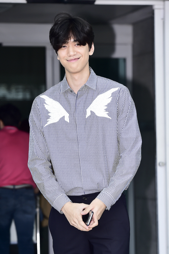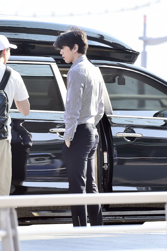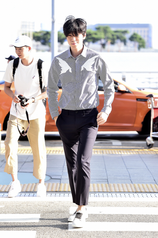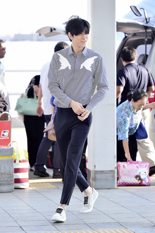 스트라이프는 사계절 인기있는 패턴. 스트라이프 셔츠는 남자들에게는 디폴트 아이템으로 옷장에 하나씩 있을법한 아이템이 아닌가. 성준은 다소 평범해 보일 수 있는 스트라이프 셔츠에 포인트가 들어간 아이템을 선택했다. 바로 화이트 컬러의 날개 자수. 숄더 바로 아래에 자리한 자수 디테일은 시선을 집중시키는 포인트도 되지만, 디자인 면에서도 어깨를 더욱 넓어보이게 하는 효과를 함께 가져다 주었다.