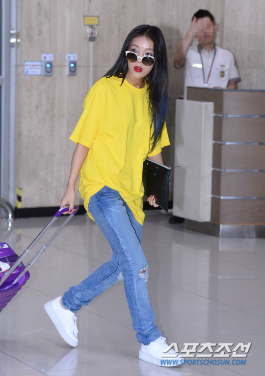 심플한 아이템들도 유빈이 착용하면 범접할 수 없는 아우라를 풍긴다. 이날 유빈은 화이트 컬러의 프레임이 세련된 선글라스를 착용했다. 그리고 블루와 블랙 컬러가 적절하게 섞인 헤어스타일로 자신의 시크한 무드를 자아냈는데, 짙은 레드 톤의 립 컬러도 유빈의 시크한 무드를 배가 시키는데 한 몫 했다. 그리고 유빈이 사랑하는 옐로우 컬러 아이템. 유빈은 옐로우 컬러의 루스한 티셔츠와 데미지 디테일이 멋스러운 블루 데님 팬츠를 함께 매치했다. 거기에 화이트 컬러의 심플한 스니커즈를 착용해 언니 포스 넘치는 공항 패션을 완성했다.