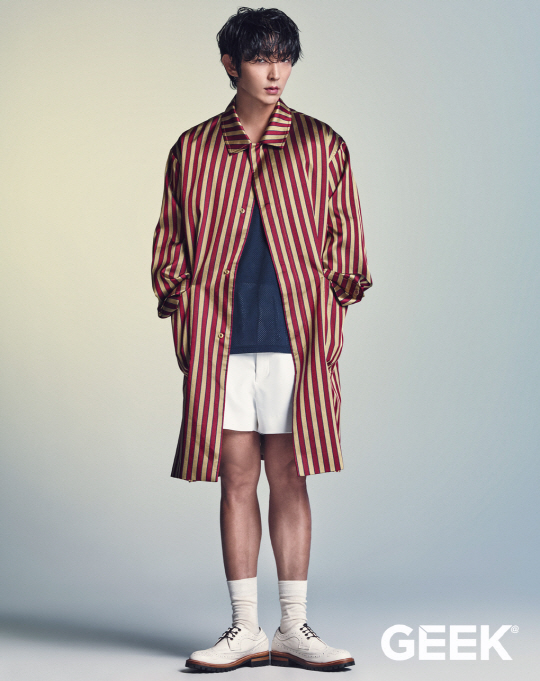 이준기의 부시시한 헤어스타일. 화보에서 착용한 의상 모든 것이 완벽하다. 이준기가 착용한 네이비 컬러 티셔츠와 화이트 컬러 쇼츠는 이준기 내면에 감춰진 소년미를 일깨우기에 부족함이 없었다. 그리고 골드와 레드 컬러가 적절하게 섞인 코트는 다양한 컬러의 의상과 적절하게 섞여 자연스러운 무드를 뿜어내 안정된 느낌을 선사했다. 거기에 화이트 컬러의 윙팁을 착용해 소년미 넘치는 화보 분위기를 완성시켰다.