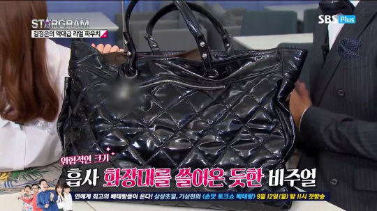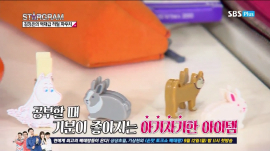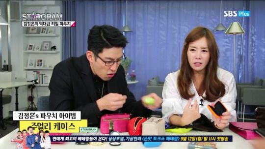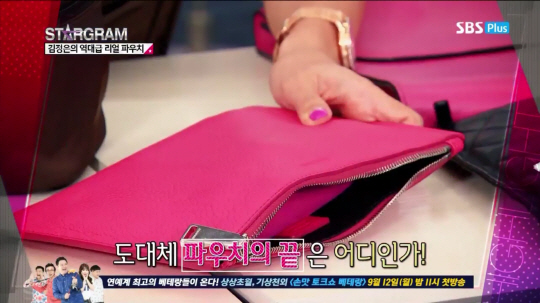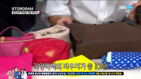 스타파우치 코너에 걸맞게 김정은의 파우치는 어마어마 했다. 큰 파우치 속 작은 파우치 까지 합쳐 무려 10개의 파우치를 들고 나온 것. 개수만큼 그 종류도 다양했다. 한결같은 미모를 유지하는 여배우 답게 촬영장에서, 일상에서 활용할 수 있는 뷰티아이템과 헤어 아이템은 주얼리 케이스까지 따로 챙겨다니는 센스를 보여줬다. 학생들을 가르치는 교수로서 박사과정을 밟고 있는 학생으로서 매일매일 필기를 하는만큼 집게, 수첩, 펜 등의 문구류 파우치까지 다양했다.