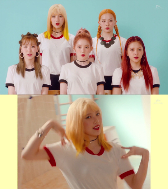 레드벨벳은 여성스러움 가득한 모습뿐만 아니라 발랄하고 활동성 넘치는 모습 또한 보여줬다. 네크라인과 소매 라인을 따라 배색이 되어있는 반팔 티셔츠와 트레이닝 쇼츠를 매치한 스타일은 마치 학교 다닐 때 입는 체육복을 생각나게 했다. 레드벨벳은 여기에 깔끔한 화이트 스니커즈와 비비드 컬러의 긴 양말을 매치해 개성 넘치는 체육복 스타일링을 완성했다.