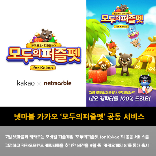 7일 넷마블과 카카오는 모바일 퍼즐게임 '모두의퍼즐펫 for Kakao'의 공동 서비스를 결정하고 카카오프렌즈 캐릭터들을 추가한 버전을 9월 중 '카카오게임 S'를 통해 출시