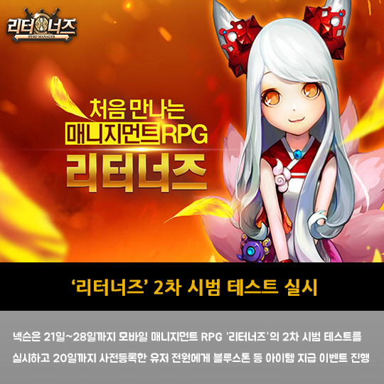 넥슨은 21일~28일까지 모바일 매니지먼트 RPG '리터너즈'의 2차 시범 테스트를 실시하고 20일까지 사전등록한 유저 전원에게 블루스톤 등 아이템 지급 이벤트 진행